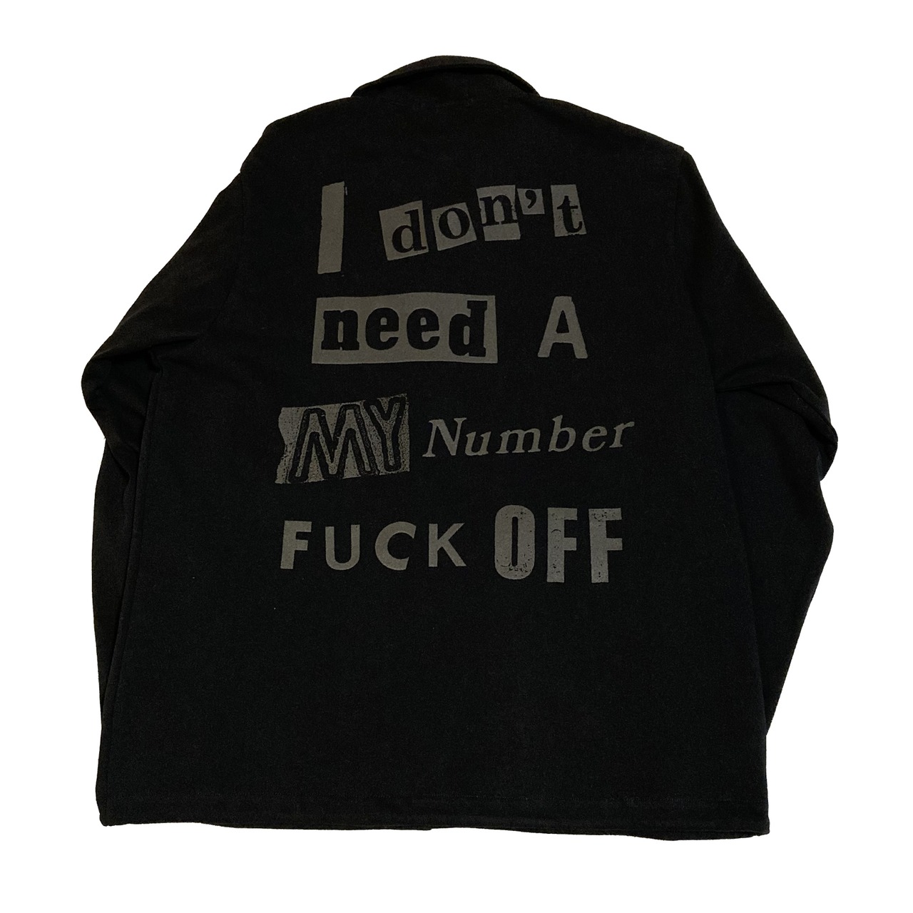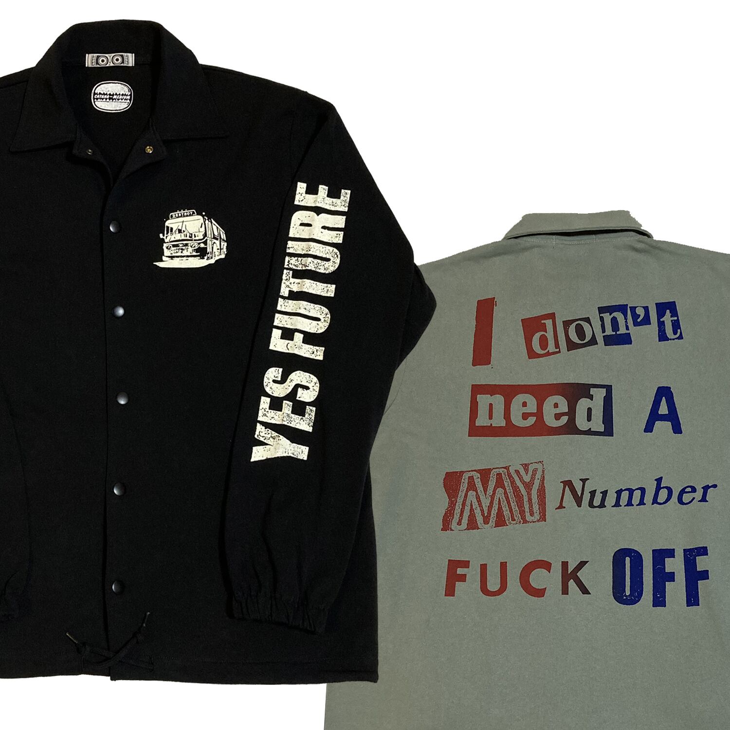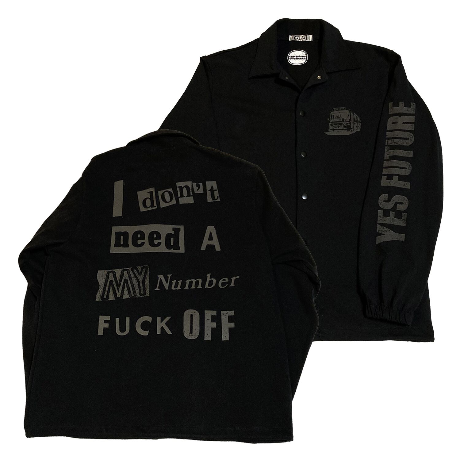 左胸にデストロイバス、左袖にはYES FUTURE、バックにはインパクト大で「My Number Fxxk Off」黙ってても背中で主張できるコットンコーチジャケットの登場。