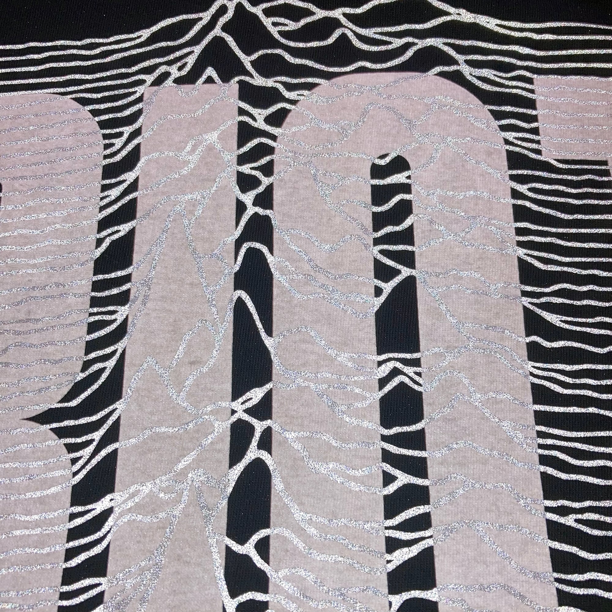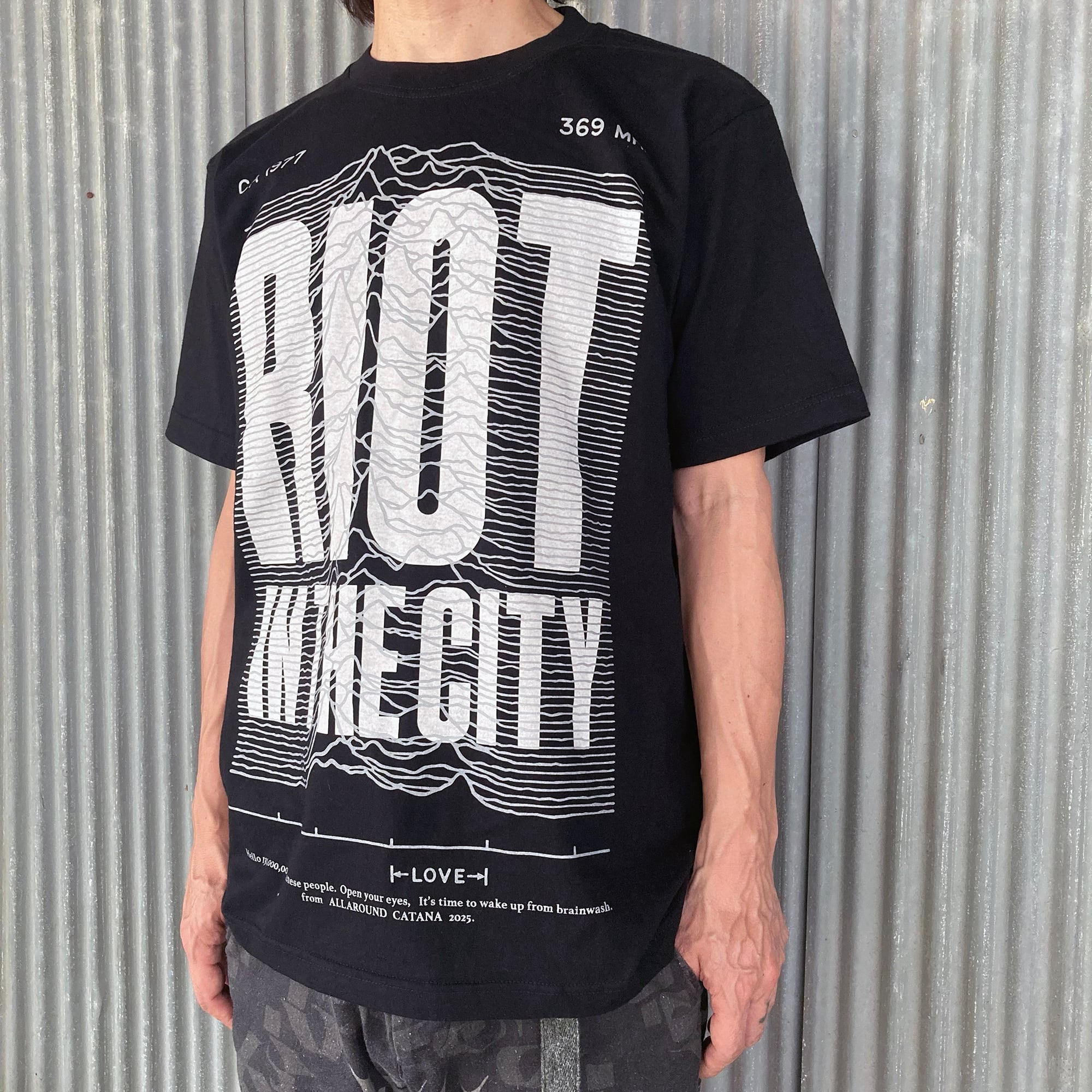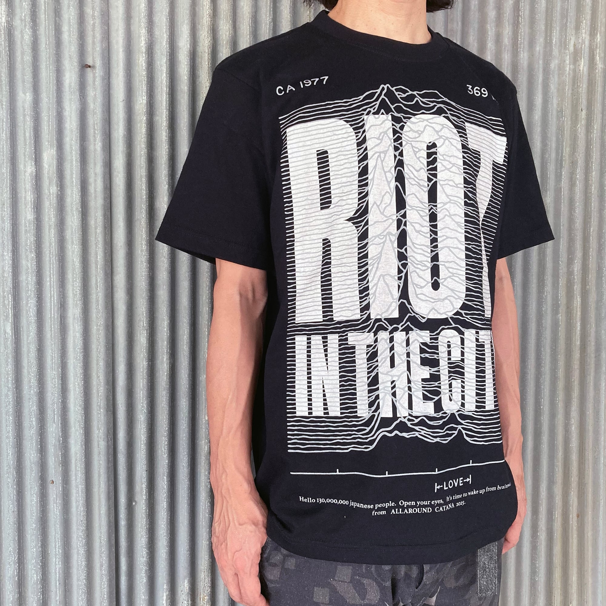 今回、コラボするにあたりメッセージやレイアウト、プリント手法にサイズなど大まかな全体的像は初めから90%決まっており、残すはALLAROUNDからいただいたJOY DIVISIONでお馴染みの波形デザインをどう料理し、他とは似て非となるモノに仕上げるかだったが、閃きは即、降りてきた。そもそもこの波形は衝撃波を表したものだが、そのまま使用したのでは何の変哲もないただの柄に成り下がる為、CATANAなりの愛溢れる皮肉なメッセージでリミックス。