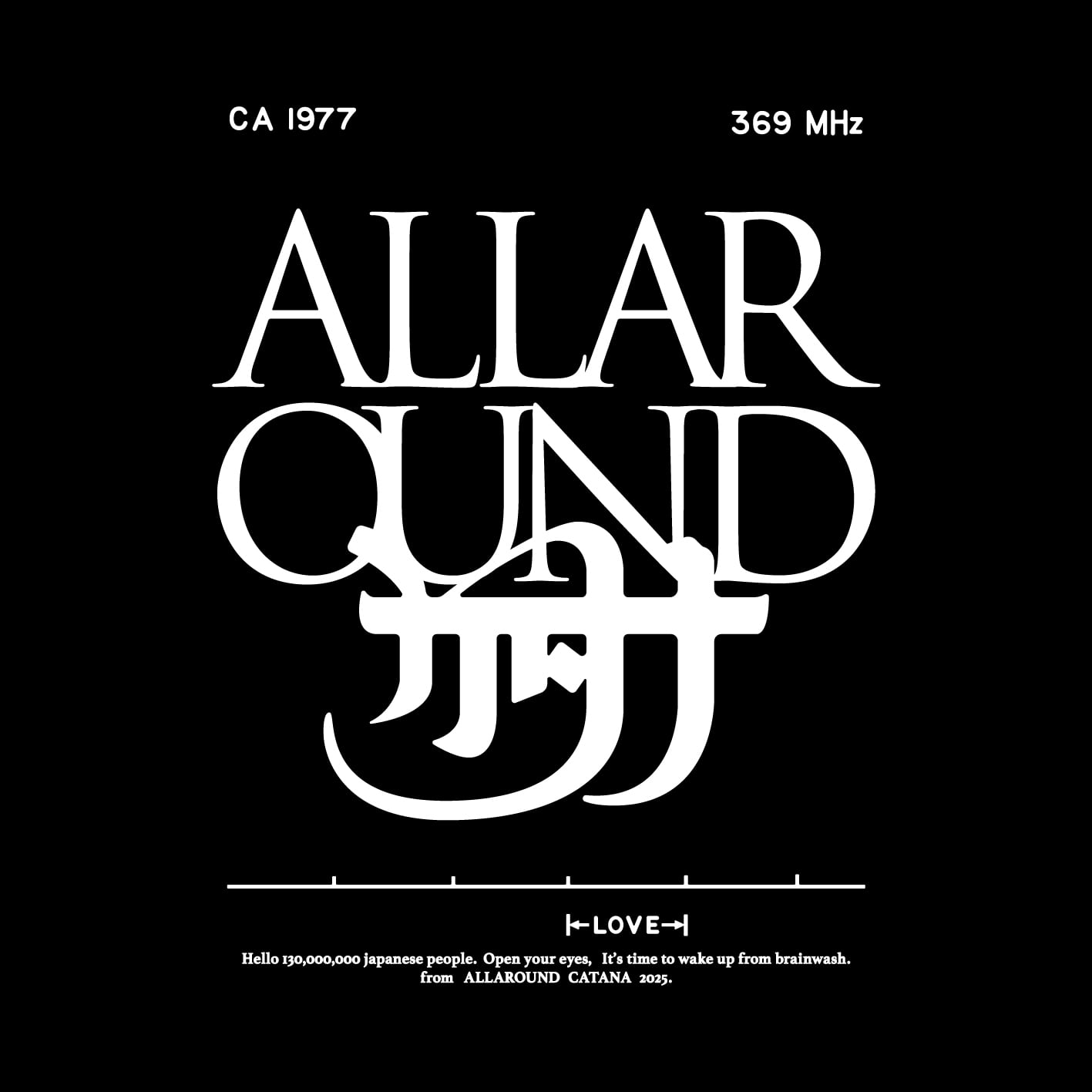 衝撃波のデザインは秀逸なまま触れず、左上CA1977はお互いの頭文字と我々が強烈な影響を受けた1977年を記し、右上のMHz(波動)は369MHz即ち弥勒(ミロク)に変換、最下部の英文には「一億三千万人の日本人よ、時は来た、洗脳から目覚めよ」と記し、その上にある測りをLOVEにする事にで、この波形を今この時代に最も必要である「愛」の衝撃波に見立てたのである。