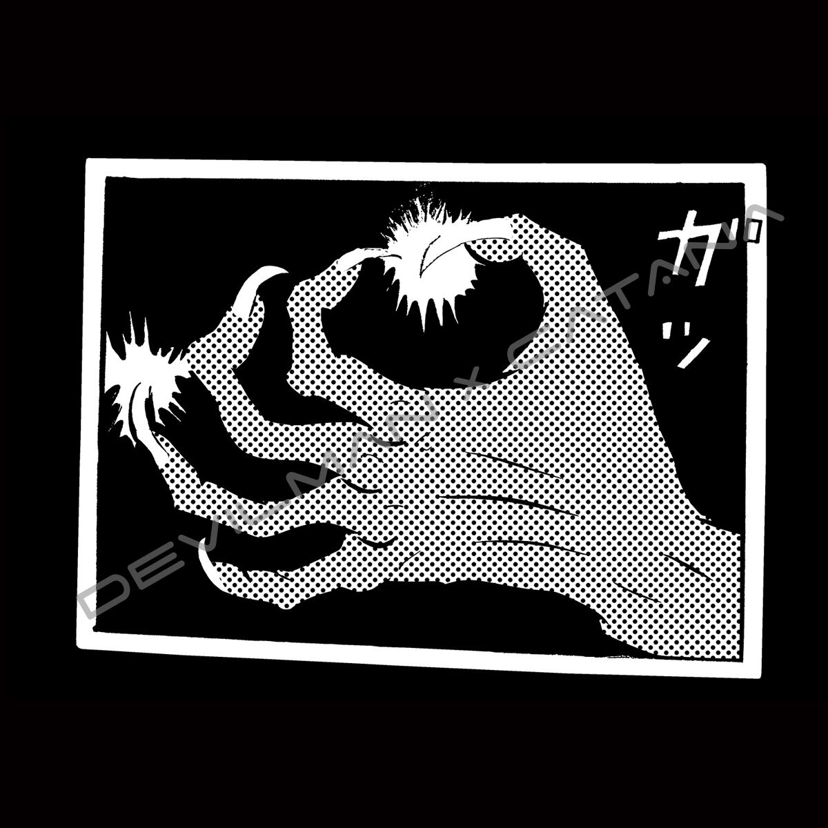 コラージュやリメイク等も考えたが原画の力強さを生かしたく、CATANAならではの視点とバランスで選びに選びぬいた名シーンをTシャツ、ロングスリーブ、パーカーに落とし込む。ただ、そのまま原画をプリントするのはナンセンスなので、逆に原画では修正不可能な細かい点や線のブレ、インク飛びなどを徹底的に修正。シンプルながらも選び抜いたデザインと考え抜いた構図は、現物を見たらわかるであろう、最高の傑作である。