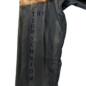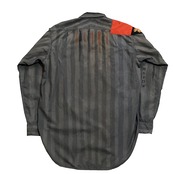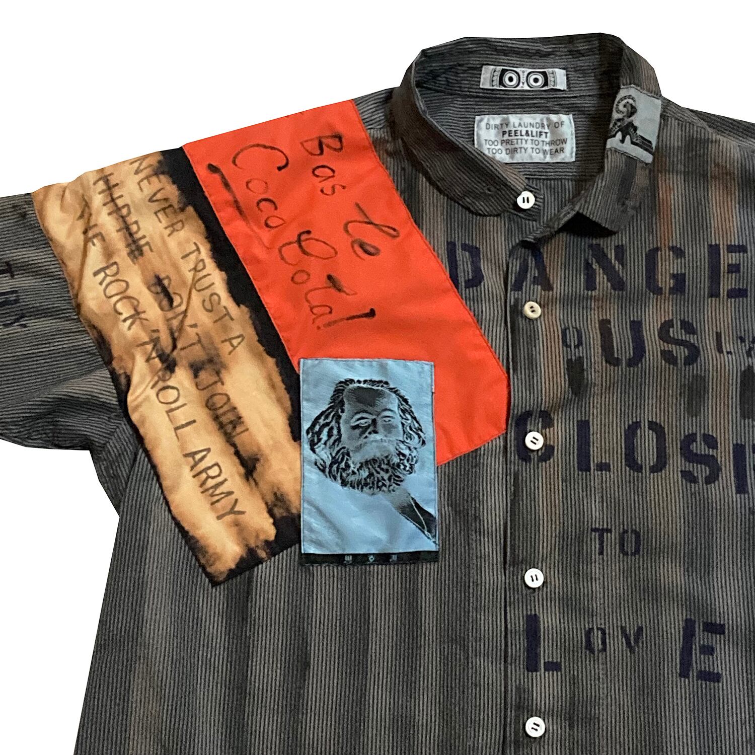 先ず、全体のカラーリングは、どんなスタイルにもフィットするよう深めのグレーに差し色でネイビーやレッドをオーバーダイ。シャツのベースはストライプの生地で、襟はピンホール付きのシャープな丸襟なので嫌味ゼロ。氣になるスローガンパッチは斜めがけで二枚「A BAste Coca Cola!」(コカコーラなんてクソ喰らえ!)と、先述の発掘された30年前のアナーキーシャツにも施してあった「JOIN THE ROCK’NROLL ARMY」を同じテイストで再現した物を装着。アナーキーシャツといえばお馴染みのアイコン「マルクスパッチ」は超極細部分まで当時物を忠実に再現したスカイブルーカラーを使用。アイコンとしては好きなのだが、マルクスの掲げるアナーキズムと今の自分の考えるアナーキズムは相違しているため、敢えて裏返しにしてある。右腕には「TRY SUBVERSION」の文字を施し、左腕上部には腕章を装着させる為のマジックデープ。また、左襟には例の鷹パッチが装着されているが、アノ部分には全く共感できないので破り捨てた仕様になっているという手の込み様。そして左胸には「ANARCHISTS ARE PRETTY」ではなく、もう一つの方「DANGEROUSLY CLOSE TO LOVE」何故ならEIGHTEENの時にHOSOYA氏が主催していたDJイベント名こそが「DANGEROUSLY CLOSE TO LOVE」であり、自分が初めてDJした記念すべきパーティーだからである。あの時の初期衝動と情熱を忘れず今も胸に。といったら大袈裟だろうか。その他にもボタンは分厚い奴仕様や、バックスタイルもしっかりと手を抜かない、匠の技で仕上げられる奇跡の一生物アナーキシャツ。全てがオリジナルハンドメイド。限定25着でここに堂々登場。